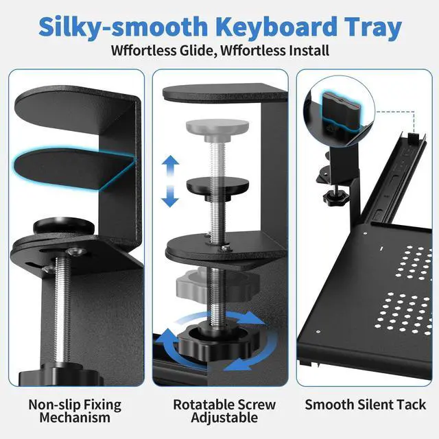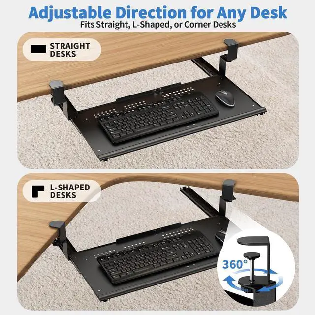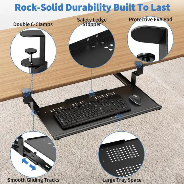 Secure Double C-Clamp AttachmentHeavy-duty iron C-clamps fix the tray firmly to straight, L-shaped, or corner desks without drillingno damage to your furniture, perfect for renters or home offices.