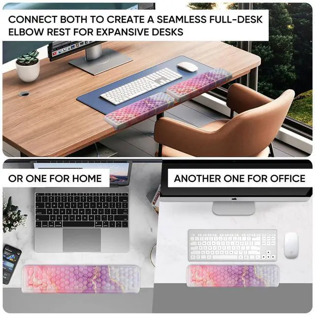 Versatile 2-in-1 ComfortOur desk elbow pad(14.9inch)is longer, but that's the genius! Connect both to create a seamless full-desk elbow rest for expansive desks, or use them separatelyone for home, one for office. It's two purchases in one, offering unparalleled flexibility and double the comfort!