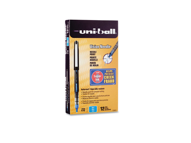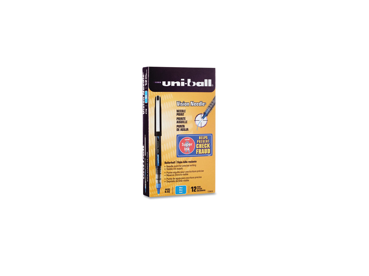 uni-ball 1734919 VISION Roller Ball Pen, Stick, Micro 0.5 mm, Blue Ink, Black/Blue Barrel, 12/Pack