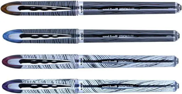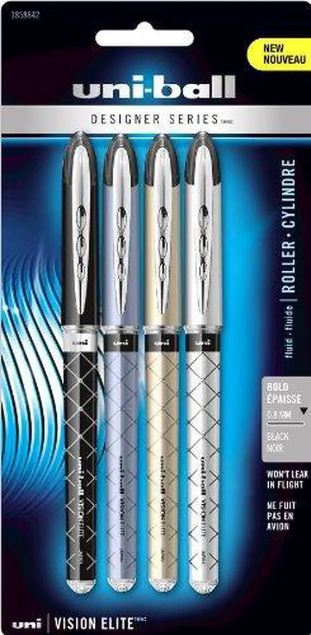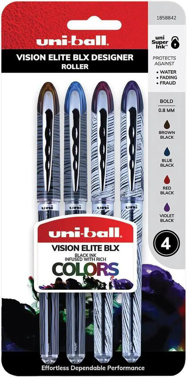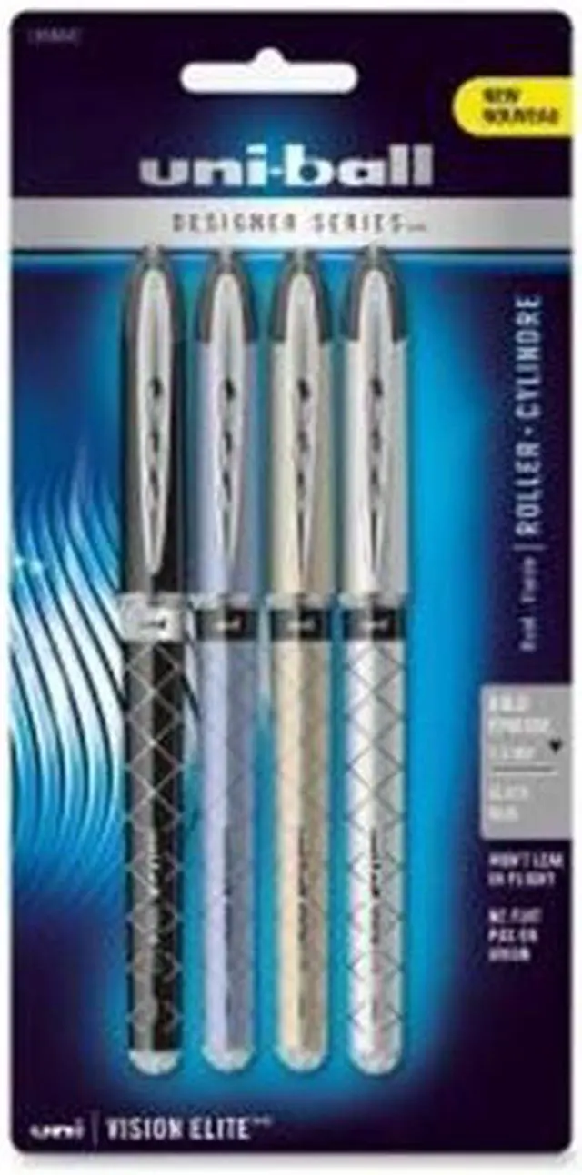 Elevate your everyday with the sophisticated style of uni-ball Designer Series. These Vision Elite Designer Rollerball Pens feature black barrels with graphic details and deliver consistent, free-flowing ink for fluid writing the moment pen hits paper. Airplane Safe-ink will not explode or leak due to a change in cabin pressure during flights. Exclusive uni-flow ink system provides consistent smoothness and color intensity. The uni Super Ink helps prevent check and document fraud. Each rollerball pen also features an 0.8 mm tip for bold writing and pocket clip on the cap for easy attachment to notebooks and more.