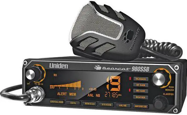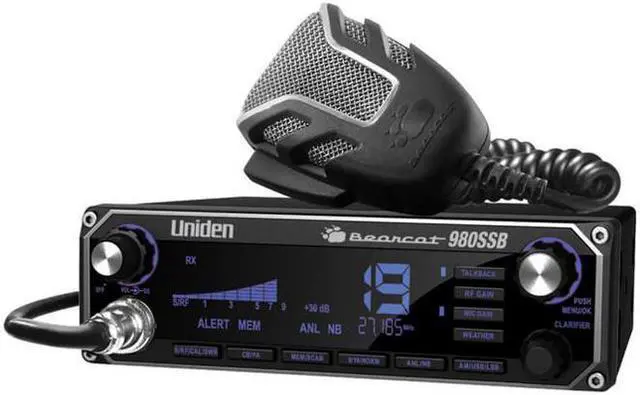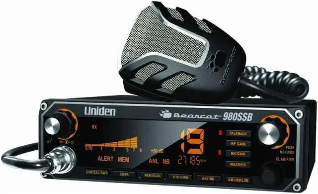 UNIDEN BEARCAT980 CB RADIO SSB USB LSB NOISE CANCELSingle Side Band USB/LSB Easy to Read Adjustable 7 Color Display Backlighting Noise Cancelling Mic Wireless Mic Compatible Variable Talkback Radio Diagnostics Large Digital S/RF / SWR Meter Frequency Display NOAA Weather Dynamic Squelch Control ANL / Noise Blanking