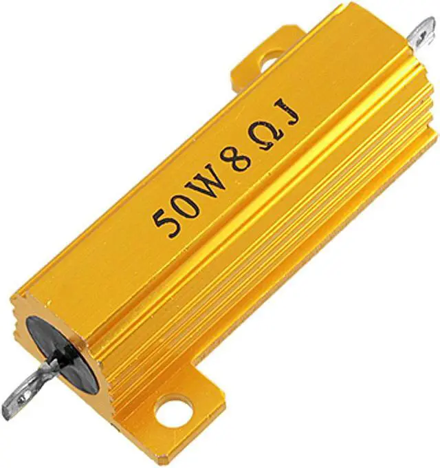 50 watt rated power, 8 ohm resistance value, 5% tolerance, aluminum case in gold tone color, chassis mount, etc.Designed with screw tabs on both sides to tighten the resistor against a chassis or heat sink for greater heat dissipation.Widely used in power supply, transducer, elevator and high requirement equipment industry.