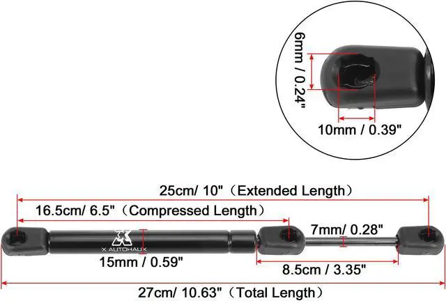Extended Length: 25cm/ 10"; Compressed Length: 16.5cm/ 6.5". Pressure 35 Lb/156 N per gas strut. The lift supports struts installation in the car to support the heavy cover. It can save your place when you need to repair your car.