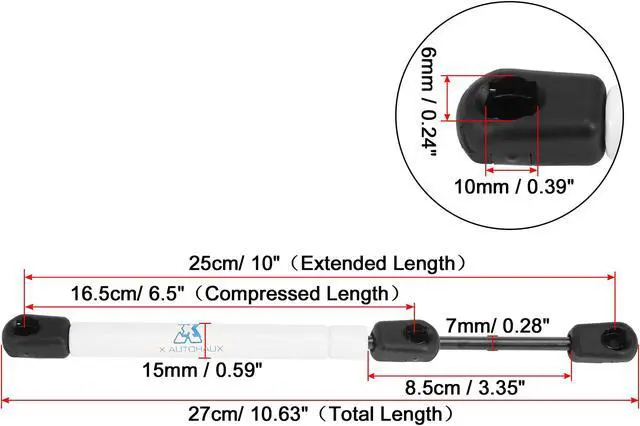 Extended Length: 25cm/ 10"; Compressed Length: 16.5cm/ 6.5". Pressure 35 Lb/156 N per gas strut. The lift supports struts installation in the car to support the heavy cover. It can save your place when you need to repair your car.