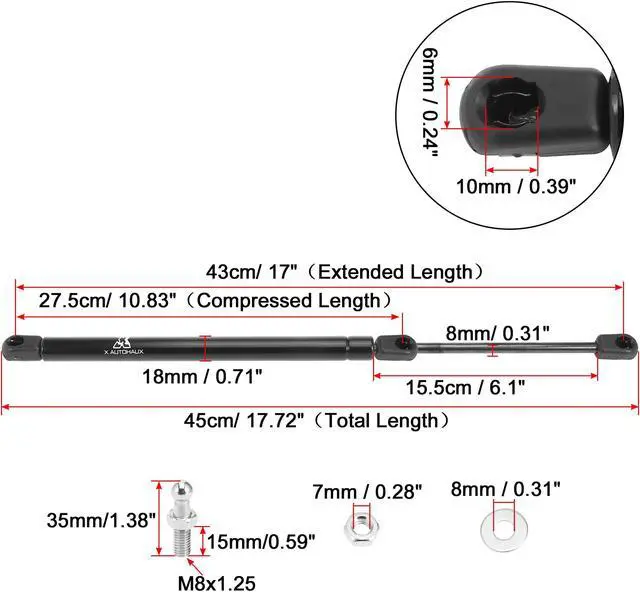 Extended Length: 43cm/ 17"; Compressed Length: 27.5cm/ 10.83". Pressure 40Lb per gas strut. The lift supports struts installation in the car to support the heavy cover. It can save your place when you need to repair your car.