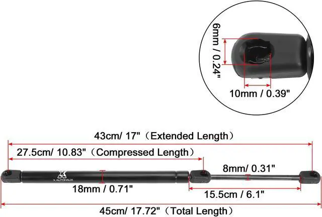 Extended Length: 43cm/ 17"; Compressed Length: 27.5cm/ 10.83". Pressure 35Lb per gas strut. The lift supports struts installation in the car to support the heavy cover. It can save your place when you need to repair your car.