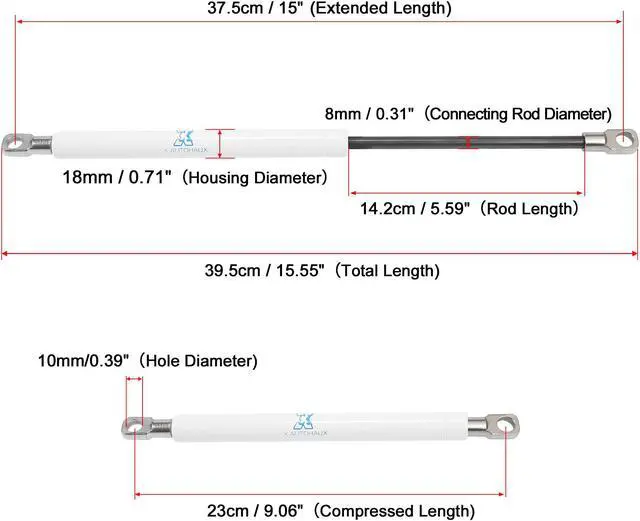 Extended Length: 37.5cm / 15"; Compressed Length: 23cm / 9.06". Pressure 100Lbs/445N per gas strut. The lift supports struts installation in the car to support the heavy cover.