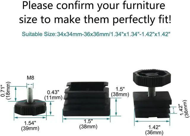 Leveling Feet 38 x 38mm Square Tube Inserts Furniture Adjustable Leveler 4 Sets
