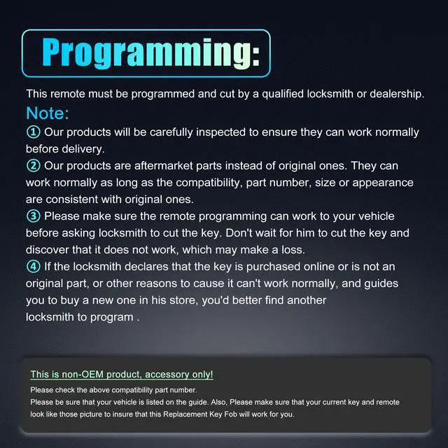 1.Please make sure the remote programming can work to your vehicle before asking the locksmith to cut the key. Don't wait for him to cut the key and discover that it does not work, which may make a loss.
