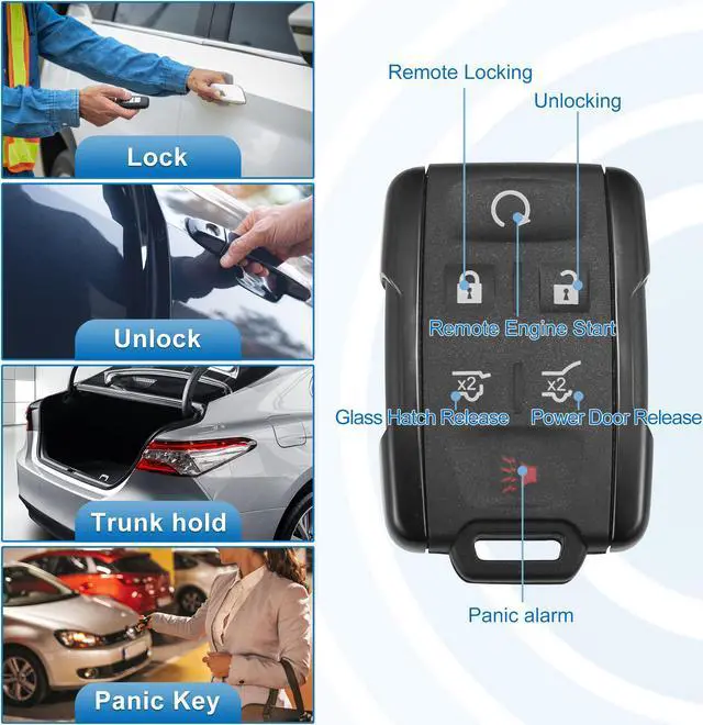 • Pros of Our Keyless Remote: With built in chip, sensitive response, 6 buttons car key: Lock, Unlock, Remote engine start, Power door release (back gate), Glass hatch release, Panic alarm. Fast response, wireless remote control.