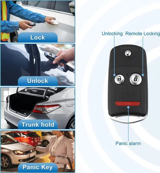 Pros of Our Keyless Remote: With built in chip, sensitive response, 4 buttons car key: remote locking, unlocking, panic, opening trunk. Fast response, wireless remote control.