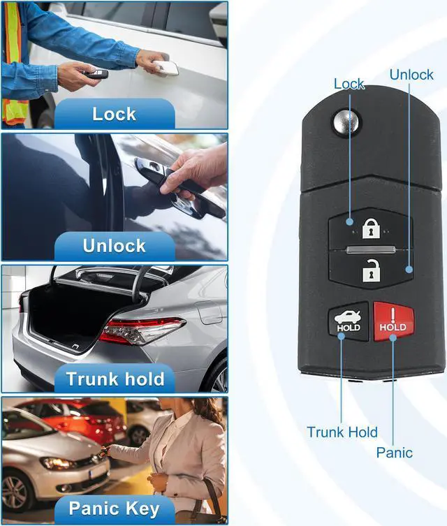 Pros of Our Keyless Remote: With built in chip, sensitive response, 4 buttons car key: remote locking, unlocking, panic, trunk hold. Fast response, wireless remote control.