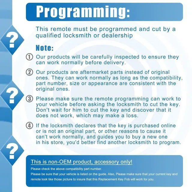 1.Please make sure the remote programming can work to your vehicle before asking locksmith to cut the key. Don't wait for him to cut the key and discover that it does not work, which may make a loss.
