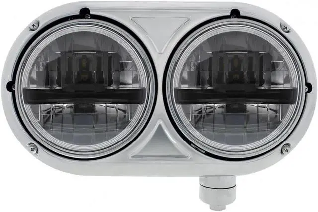 Fully assembled left hand side Peterbilt 359 headlight with excellent 304 grade stainless steel housing and dual high power LED headlight with black inner cross bar.