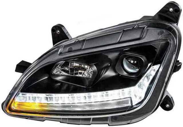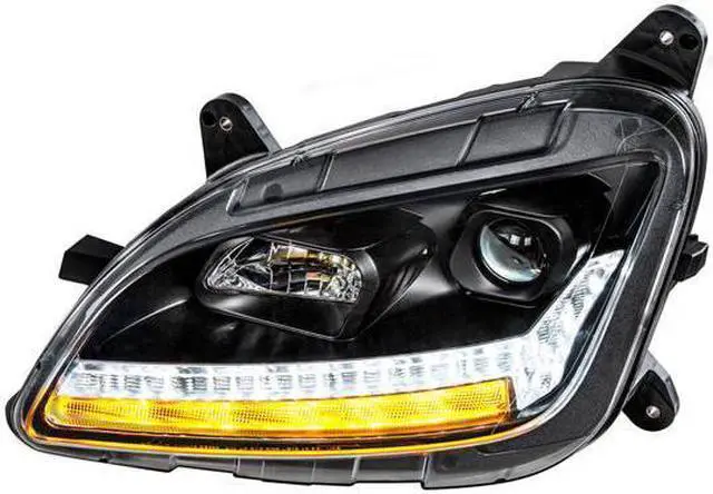 Headlight assembly for Peterbilt 579/587 trucks / Projection headlight with LED position light and LED sequential turn signal / Patent Pending headlight lens design with reflective turn signal diffusers for wider visibility / Easy connection, plugs into existing wiring harness / DOT/SAE Approved / Driver