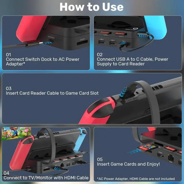 1. Connect the switch dock to the AC power adapter, and we recommend using the original Nintendo Switch power adapter.
