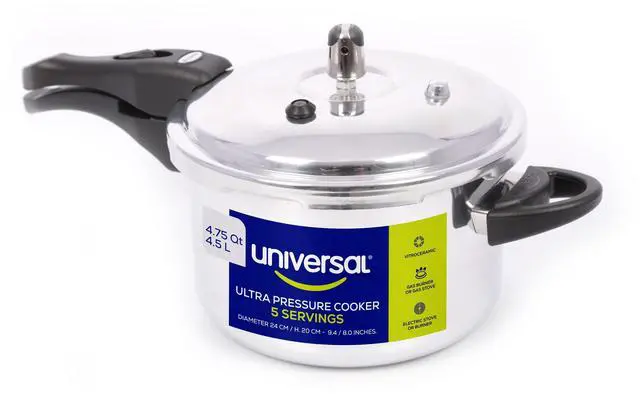 The Ultra Pressure Cooker by is a durable, rust-resistant aluminum pressure cooker designed to prepare up to 5 servings with ease. Its 4.75 Qt capacity is perfect for cooking a variety of meals while preserving nutrients, flavors, and moisture, thanks to even heat distribution. Equipped with an advanced external sealing system, it features a safety button on the handles for effortless opening and closing. The main pressure valve (80 kPa) includes a cleaning rod for easy maintenance, while additional auxiliary safety valves and a pressure relief window ensure a safe cooking experience. This high-performance pressure cooker is compatible with gas, electric, and glass-ceramic stovetops and is also dishwasher-safe for hassle-free cleaning. (Not compatible with induction cooktops.) Dimensions: Diameter: 9.4 inches (24 cm) Height: 8 inches (20 cm) Crafted by , a brand known for its high-quality, long-lasting kitchen products, this pressure cooker is built for everyday convenience and durability.