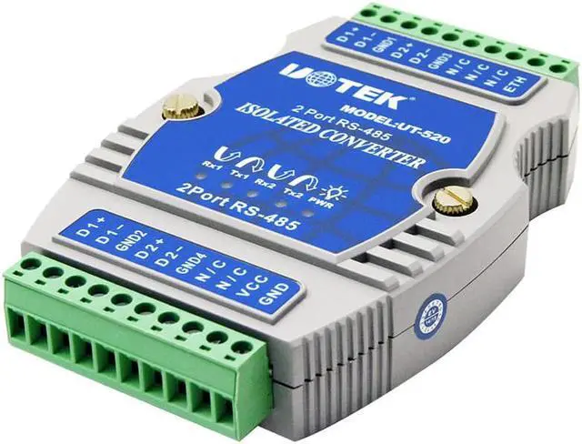 UT-520 optoelectronic isolated repeater provides connection for point to point, point to multipoint communication. For point to multipoint mode, each repeater is allowed to connect 128 sets of RS-485 devices with baud rate 300- 115.2K bps. The power and data flow indicators indicate the working status.
