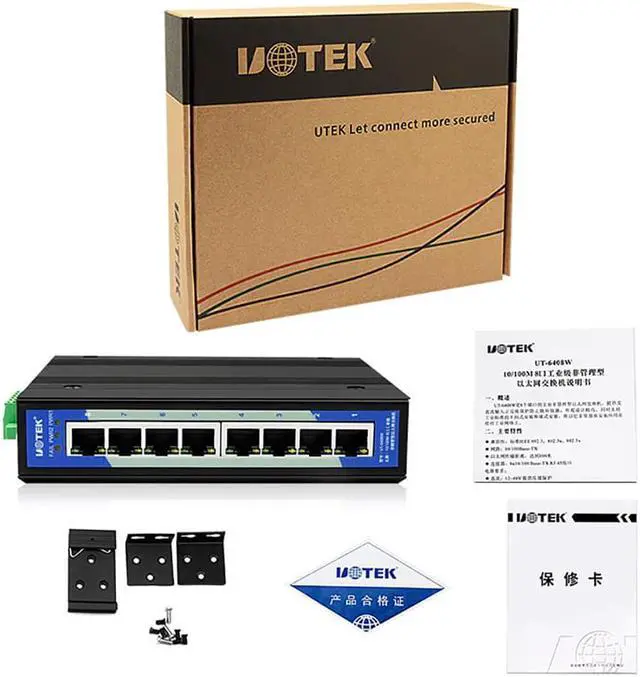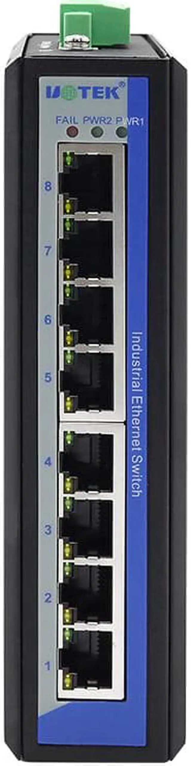 UT-6408W is an industrial unmanaged Ethernet switch with 8 fast Ethernet ports. It supports DC input reverse polarity protection; this protects the device from burning. UT-6408W supports industrial standard Din-Rail and wall-mounted installation; it is easy to be installed at any industrial field.