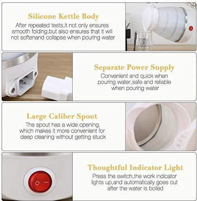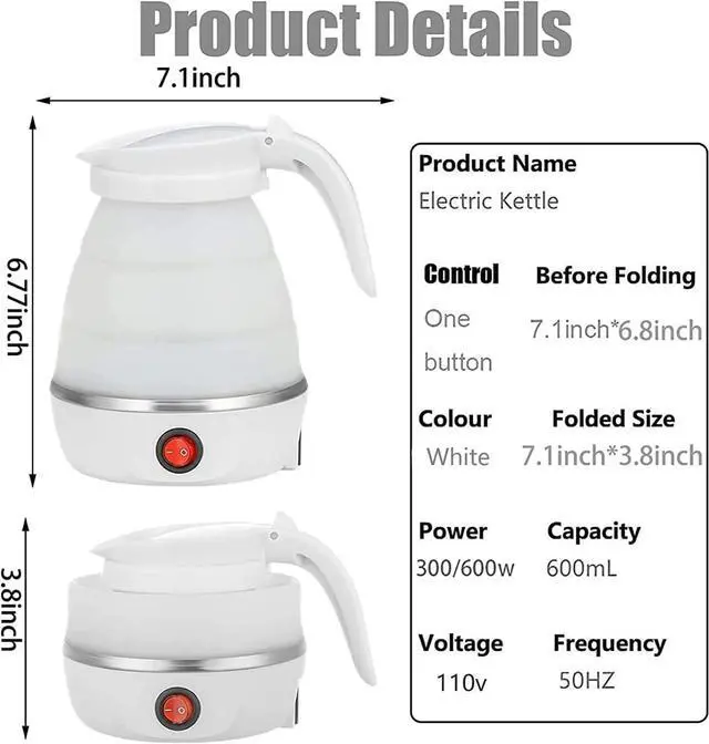 The electric kettle adopts a creative foldable design, the folded size is only: 7.2x5.2x3.8inch, easily fits into your suitcase and backpack, saves a lot of space when packing, easy to carry.