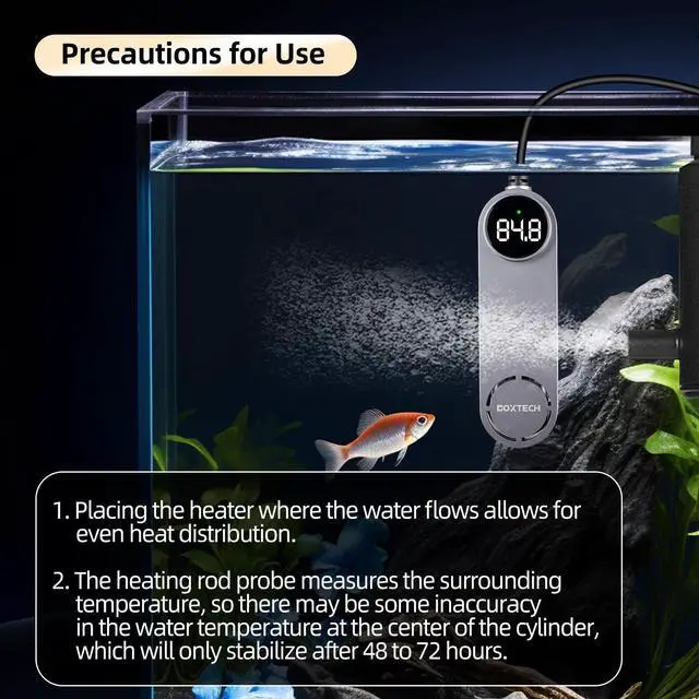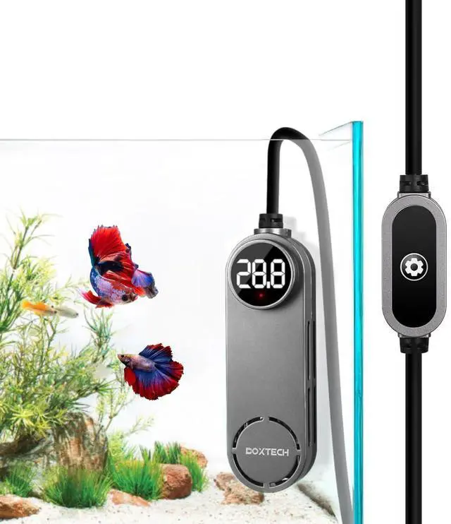 Designed for 5–20 gallon tanks – ideal for bettas, shrimp, turtles. Strong suction cups; install vertically (fish) or horizontally (turtle).(50W for 5–10 gallon, 75W for 5–20 gallon)