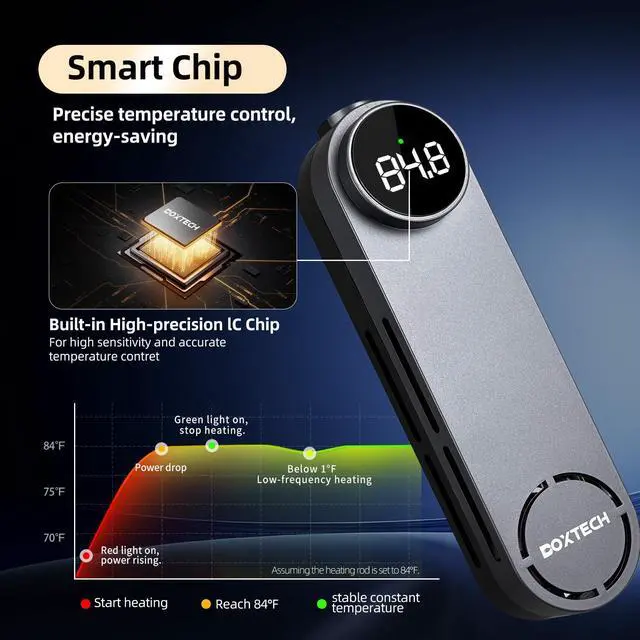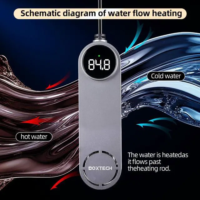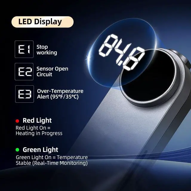 Features smart dual-mode thermostat and high-precision sensor. Auto-cuts power at set temp. External LED shows real-time water temp (°F/°C), ensuring accuracy and safety.