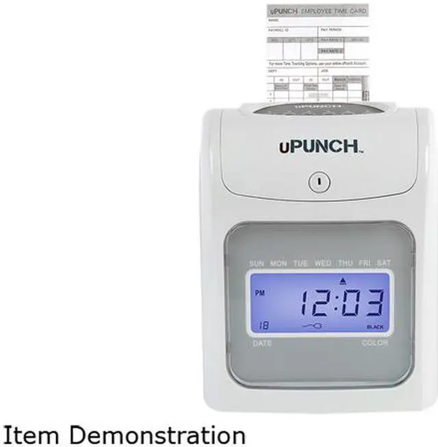 The uPunch HN4000 is an easy-to-use electric punch card time clock designed specifically for small businesses with 50 or fewer employees. It allows employees to punch in and out with the ease of a traditional punch time clock, and offers the ability to automatically track and calculate hours on paper time cards. This greatly reduces effort needed to manage employee attendance. The time clock is easy to mount on a wall or table and is easy to program, while the automatic card feed feature aligns time cards for accurate punching and printing.