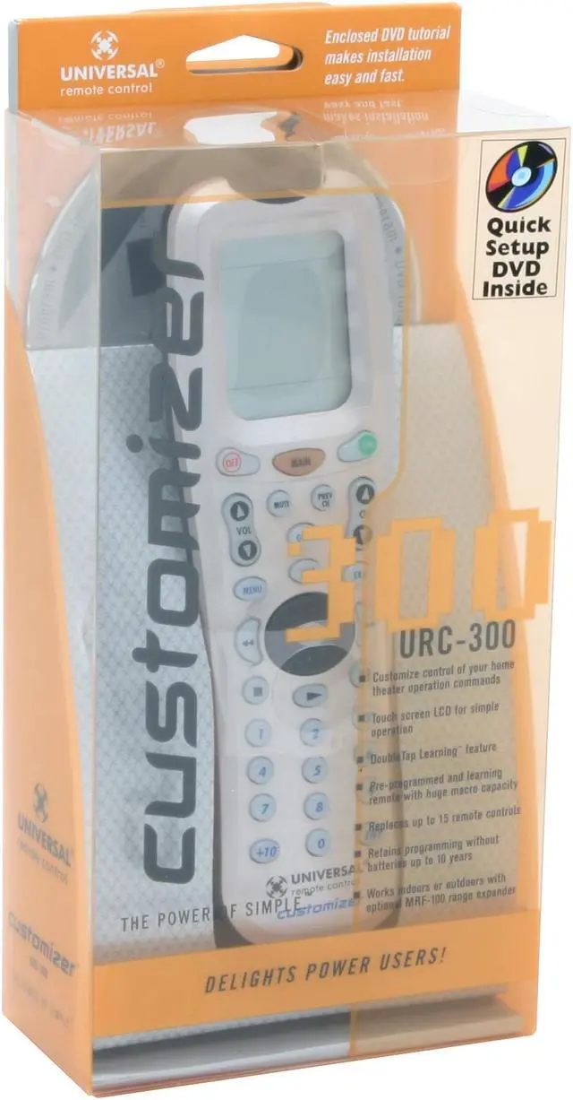 | Features | The Customizer (URC-300) universal and learning remote control was designed for A/V enthusiasts who want to "customize" all aspects of home theater operation. The Customizer's touch screen LCD panel can be edited based on consumer device and function label preferences. The URC-300 sends both IR and RF signals, making whole-house operation (indoors and outdoors, through cabinets, walls and doors) possible with the addition of the optional MRF-100 RF receiver base station. The URC-300 can be programmed to execute "macros" including hundreds of A/V operation commands by pressing one button. Transmits both IR and RF signals Touch screen LCD for simple direct operation Replaces up to 15 remote controls Instant access up to 40 favorite channels with the press of one button Pre-programmed and learning remote with 647 macro buttons, each with up to 190 commands Automate activities with advanced features: favorite channel, punch through and more Retains programming without batteries up to 10 years Works indoors or outdoors with the optional MRF-100 RF receiver Learning Capability: 720 IR commands at standard frequencies (15 kHz to 100 kHz) |