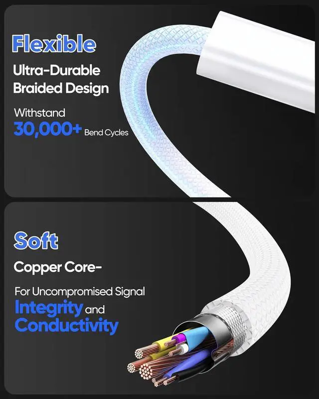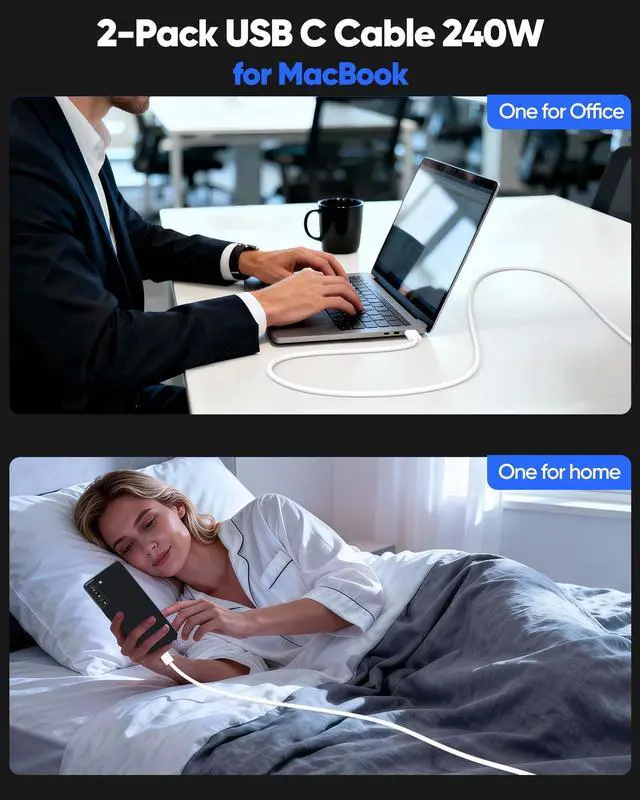[Soft & Flexible & Durability Design] Features a standard USB-C connector, designed to meet the exact specifications of the USB Type-C industry standard for universal compatibility and reliable performance. Tough Flaxible Braided Cable + Reinforced Connector-240W USB-C Charge cable for MacBook Air Features a high-strength, abrasion-resistant braided jacket for superior pull and bend resistance, far outlasting standard rubber cables.
