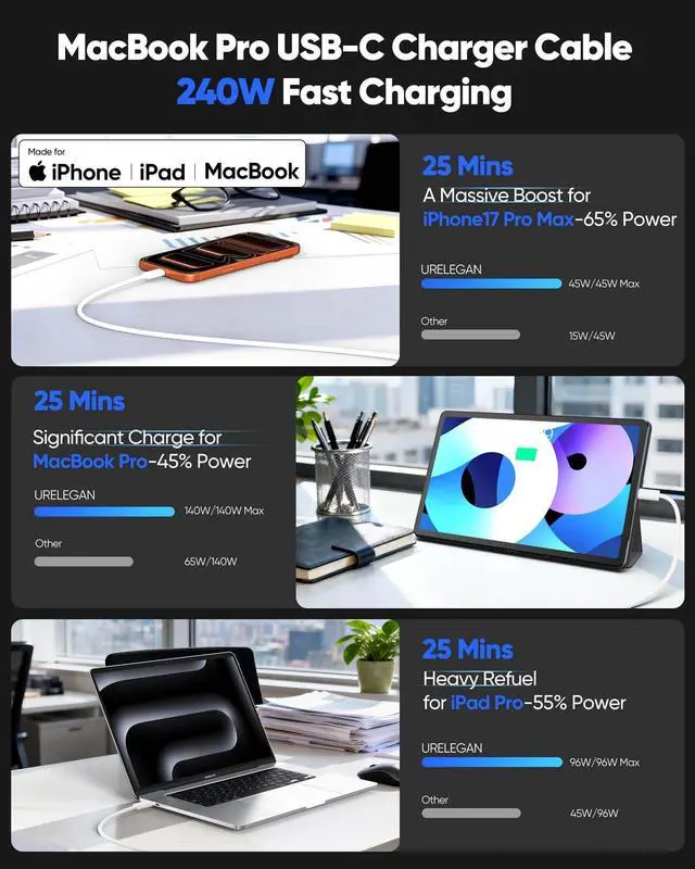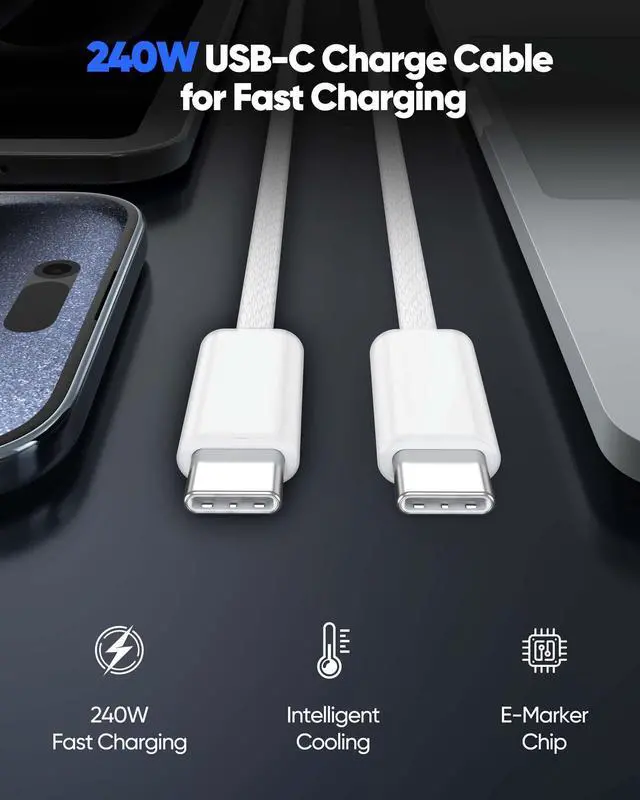 [240W Ultra-Fast Charging]Engineered for the Apple ecosystem, supports up to 240W ultra-fast charging, perfectly compatible with your MacBook Pro/Air, iPhone 17/ 16/15 series, iPad Pro/Air and iMac. Supports the latest USB PD 3.1 standard,built-in E-MARKER chip ensures safe power negotiation and delivers full power output, quickly replenishing your Apple devices.Backward compatible with 140W/100W/65W/45W/30W/20W/15W.
