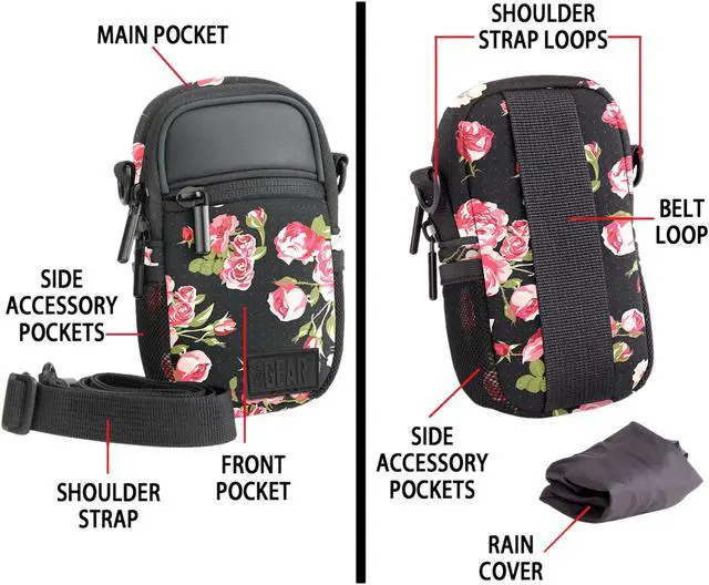 | Specifications | USA Gear Compact Camera Bag with Waterproof Rain Cover, Belt Loop & Shoulder Strap Sling Features cushion padding, scratch-resistant interior tricot lining, front zippered pockets, and two side stretch-net pockets |
