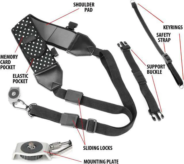 | Specifications | TrueSHOT Rapid Fire Camera Neck Strap Sling with Adjustable Neoprene and Gliding Buckle Features a high level of comfort and security, a durable metal screw-in plate for cameras tripod, and accessory pockets for memory cards, batteries and more |