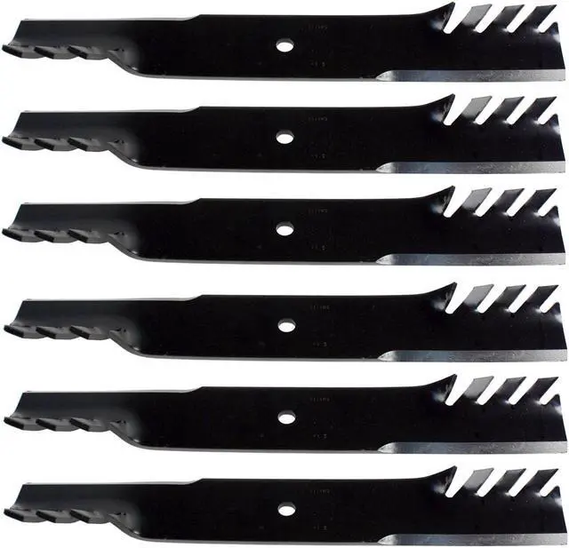 The E6 blades are the widest, thickest blades offered by USA Mower Blades. E6 blades are 3-inches wide and 0.250-inches thick. These extra-thick blades are heavy-duty and will tackle any lawn with ease. Designed for commercial applications, E6 blades offer unmatched durability and longevity. These toothed blades provide more lift and can be used for mulching, side-discharge, or bagging applications.
