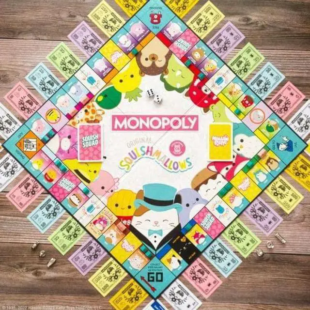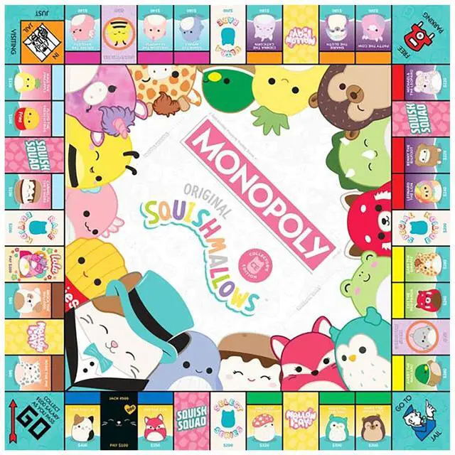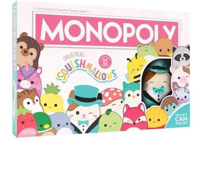 Squishmallows Monopoly | Collector?s Edition Featuring Cam The Cat Plush | Buy, Sell, Trade Spaces Featuring Squshmallows | Collectible Classic Monopoly Game | Officially-Licensed Squishmallows Game. Squad up with the plushiest version of the classic family game you?ll ever play! MONOPOLY: Squishmallows Collector?s Edition lets players buy, sell, and trade their favorites from the Classic Squad to the Fantasy Squad, including Fifi the Fox and Benny the Bigfoot! This special edition comes with an exclusive 4? Cam the Cat plush to start off your journey, plus custom tokens that represent Squishmallows fun. Set up valuable Squads and Collections to be the last one with Squishcash to win!