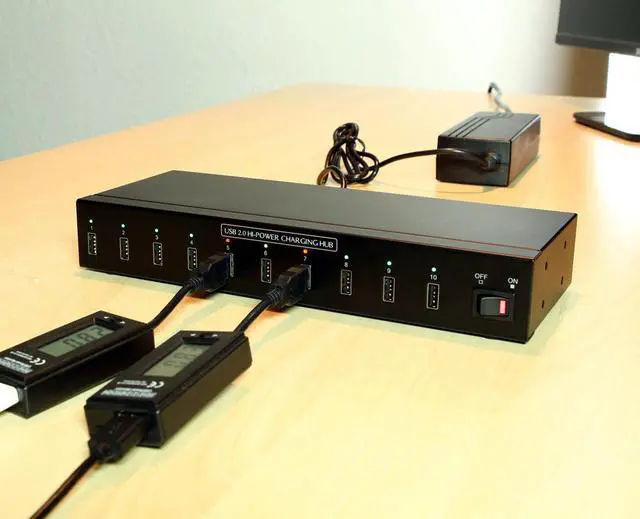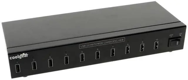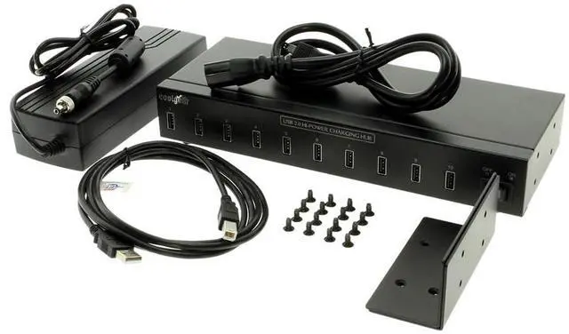 The 10-Port USB Charging hub is a solution for quick charging or synchronizing up to 10 iPads iPhones iPods and USB charging devices operating simultaneously comes with power adapter USB cable and rack mounting brackets and screws.
