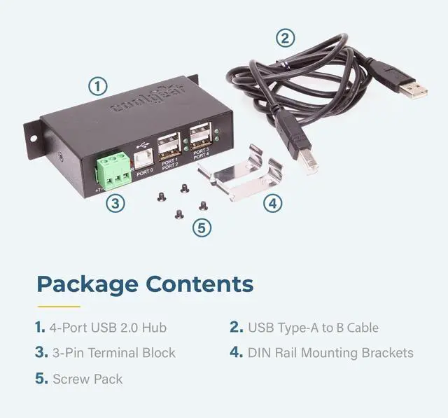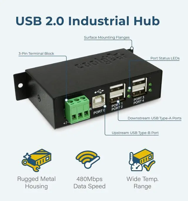 This Industrial 4-Port USB 2.0 Hi-Speed Hub is designed to be compact but mountable for stability. It provides an ideal solution to expand 4 USB 2.0 ports from one single USB 2.0 host port for your computer peripherals and is constructed with industrial-grade metal chassis.