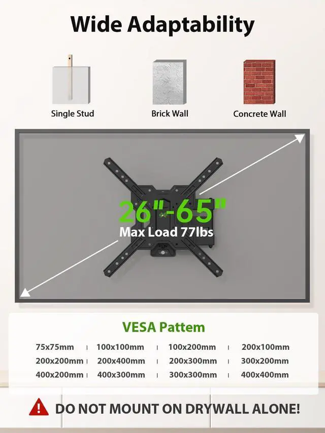 Note: This TV wall mount is designed for use in wood stud and solid concrete wall. DO NOT install into drywall alone.