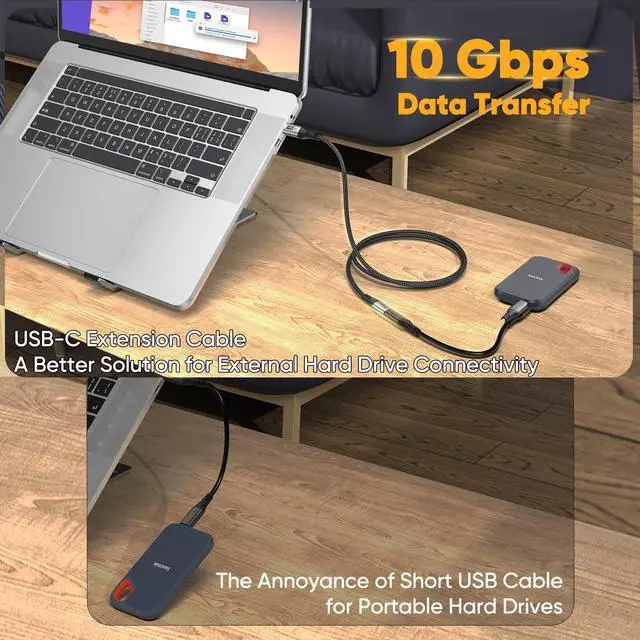 10Gbps HighSpeed Data Transfer10FT USB C data Cable male to female for rapid large-file transfers. Designed for seamless compatibility with Samsung, Sabrent, and Western Digital SSDS, efficiently transferring music, files, pictures and videos from phone to laptop in short time.