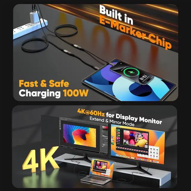 4K Video OutputUSB C monitor extender cable delivers stunning 4K ultra HD video, connecting seamlessly to USB-C phone/ laptops like iphone17/16/15, MacBook, MacBook Air/Pro,iPad, Dell, ThinkPad and LG/HP/Dell to portable monitor and larger display. Note: Video function requires devices with a USB-C port supporting DP Alt Mode.
