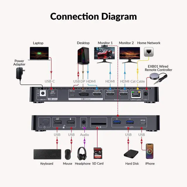 This product is a 2x1 KVM Dock switcher with Dual Monitor support, it is designed for users who need seamless control and peripheral sharing between a laptop and a desktop. It features dual 4K@60Hz video outputs, ideal for high-resolution dual-monitor KVM applications. The switcher provides two input options: one full-featured USB-C input for laptops and one combined HDMI + DP + USB-C 3.0 input for desktops.