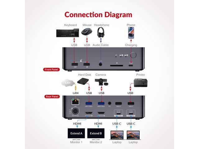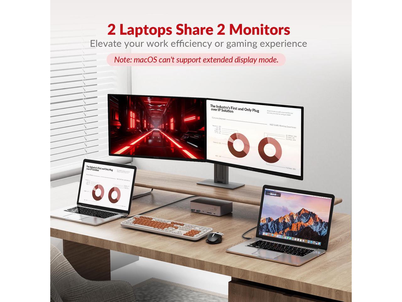 - Dual Screens, Double Productivity: The docking station KVM switch connects 2 laptops and 2 monitors with 2x USB-C (MST) inputs and 2x HDMI outputs. Seamlessly switch between your work and personal laptops to boost your productivity with this USB-C KVM switch. Note: Mac OS cant output extended dual screens. Not compatible with 5K monitors (e.g., 5120x1440). Max supported resolution for 49" ultrawide monitors is 3840x1080.