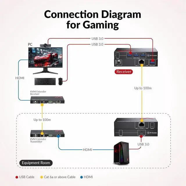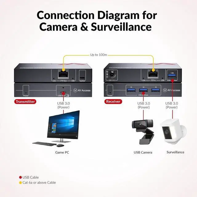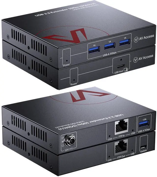 U3EX100 is a new generation of USB 3.2 & USB 3.0 extender. It supports USB 3.2 Gen 1 standard with up to 5Gbit/s USB data transmission rate, and is backward compatible with USB 3.0, USB 2.0, and USB 1.1 specifications. This USB extender can extend the USB 3.2 & USB 3.0 data up to 100m/330ft via a single Cat 6A/7 F/FTP or U/FTP cable. It has a built-in 4-port USB hub in the receiver, which can be connected to multiple USB devices. Pure hardware architecture is compatible with Control / Bulk / Interrupt / Isochronous transmission protocols. For multiple USB device scenarios, this extender can also be used with an external USB 3.2 & 3.0 hub.