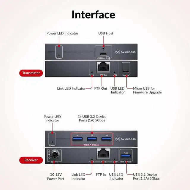 The transmitter can be powered by the USB Type-C host, and the receiver can be powered by the local power source. The extender supports USB VBUS pass-through, if the USB Host port of the transmitter is not connected to a host device, the USB Device ports on the receiver have no VBUS output.