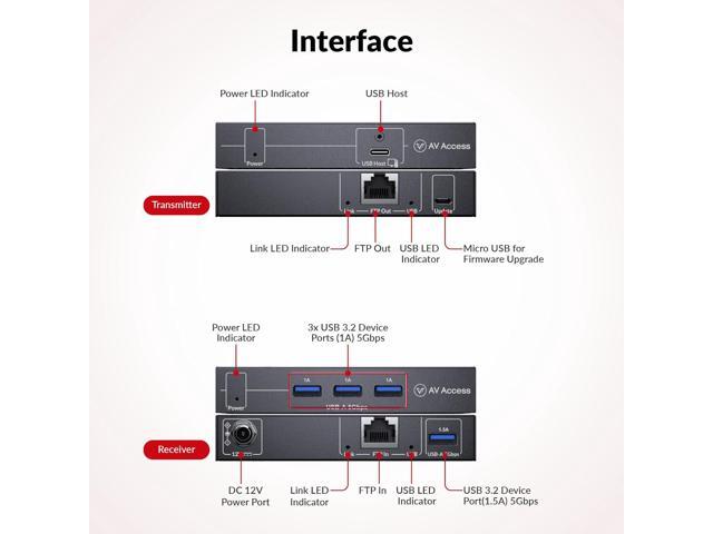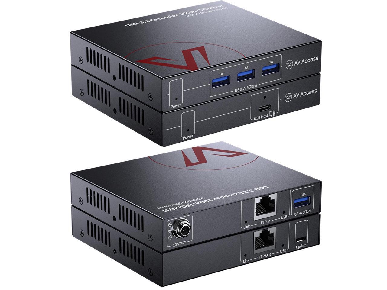 AV Access HDbaseT USB 3.2 Extender Over Ethernet Cat6a/7 100M/330FT, 4 USB 3.2 Ports 5Gbps for Long Distance Extension, 6.6FT USB C to A Cable Included, Plug&Play, Supports All Operating System, PoC