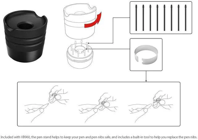 Included with VB960, the pen stand helps to keep your pen and pen nibs safe, and includes a built-in tool to help you replace the pen nibs.