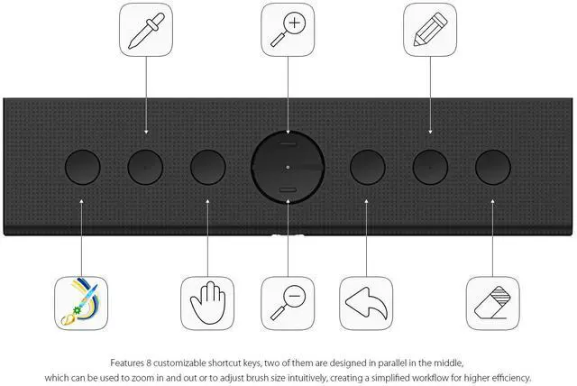 2.Features 8 customizable shortcut keys, two of them are designed in parallel in the middle, which can be used to zoom in and out or to adjust brush size intuitively, creating a simplified workflow for higher efficiency.