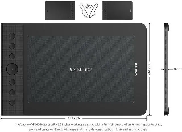 1.The Vabnoo VB960 features a 9 x 5.6 inches working area, and with a 9mm thickness, offers enough space to draw, work and create on the go with ease, and is also designed for both right- and left-hand users.