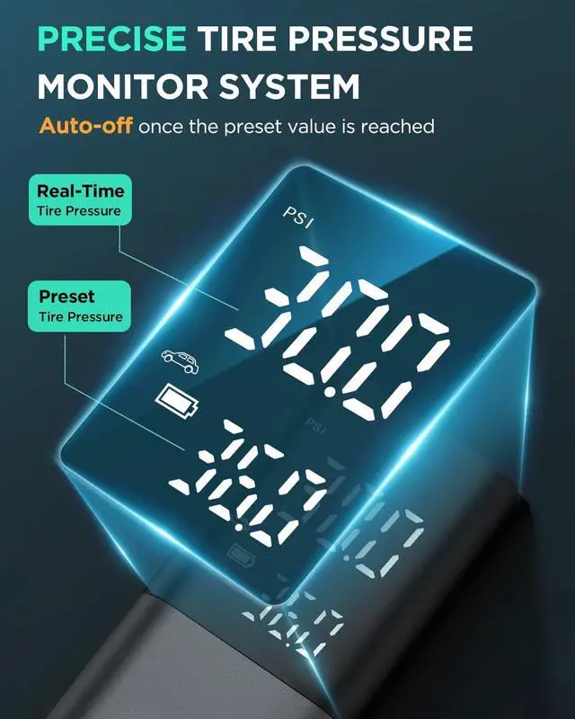 This cordless tire inflator features 4 modes (Car, Motorcycle, Bicycle, and Ball) for quick inflation, or you can +/- pressure value. Smart AI technology ensures perfect inflation by automatically stoppingwhen the desired pressure is reached. The portable air compressor ensure precise inflation