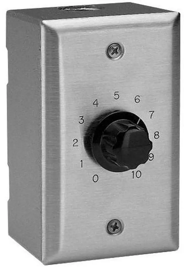 The V-1092 permits adjusting speaker volume from a convenient wall mounted location. The volume control features a stainless steel plate with embossed numbers and fits a single gang electrical wall box. The wall mount volume control controls volume of up to 150 one-way self-amplified speakers.