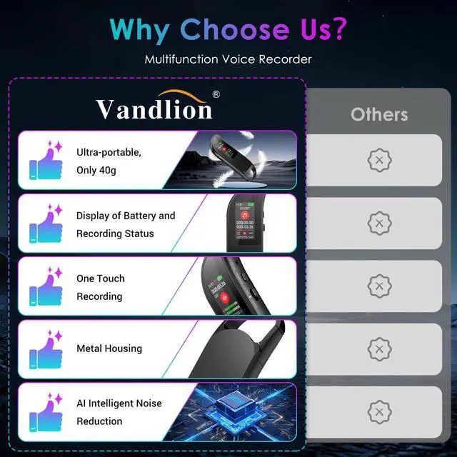 | Specifications | Size: 64GB, Brand: Vandlion, Format_0: wav, Format_1: mp3_audio, Battery_weight: 3.5 grams, Battery_cell_composition: lithium_ion, Display_size: 0.98 inches, Skip_offer: false, Item_weight: 40 grams, Part_number: V11B, Unspsc_code: 52161535, Manufacturer: Vandlion, Model_number: V11B, Num_batteries_type: aa, Num_batteries_quantity: 1, Control_method: touch, Headphones_jack: 3.5 millimeters, Item_dimensions: 0.39 L x 0.86 W x 2.99 H inches, Lithium_battery_packaging: batteries_contained_in_equipment, Lithium_battery_energy_content: 0.55 watt_hours, Number_of_items: 1, Batteries_included: true, Batteries_required: true, Compatible_devices_0: Personal Computer, Compatible_devices_1: Smartphone, Hardware_interface: usb_c, Included_components_0: 1 x Digital voice recorder, Included_components_1: 1 x USB-C Data Cable, Included_components_2: 1 x Headphone, Included_components_3: 1 x User Manual, Item_package_weight: 0.168 kilograms, Warranty_description: 2 Years, Microphone_form_factor: Built-In, Item_depth_width_height_depth: 0.39 inches, Item_depth_width_height_width: 0.86 inches, Item_depth_width_height_height: 2.99 inches, Item_package_dimensions: 1.905 L x 13.4112 W x 13.4874 H centimeters, Memory_storage_capacity: 64 GB, Contains_battery_or_cell: battery, Product_site_launch_date: 2025-09-16T07:00:00Z, Microphone_operation_mode: Stereo, Number_of_lithium_ion_cells: 1, Includes_rechargable_battery: true, Battery_installation_device_type: not_installed, Supplier_declared_dg_hz_regulation: not_applicable, Has_multiple_battery_powered_components: false, Supplier_declared_has_product_identifier_exemption: true |